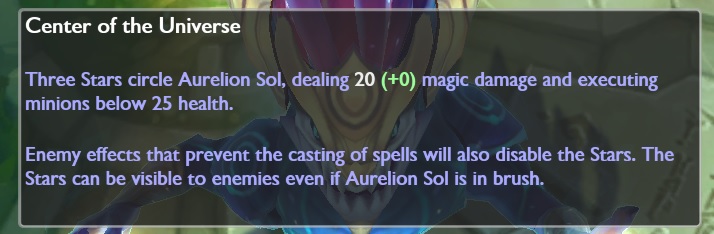 "Three Stars circle Aurelion Sol, dealing 20-97 (+ [.17 + .01 per level] AP) magic damage and executing minions below 25 health.